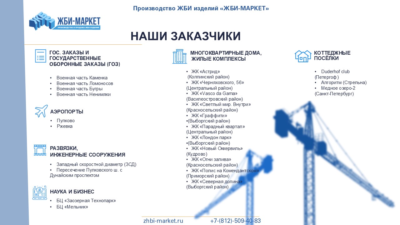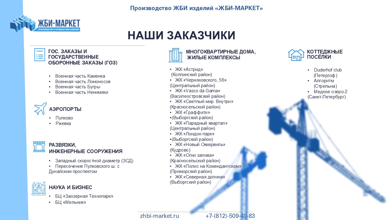 "ЖБИ-Маркет" - это надежный поставщик железобетонных изделий в Зеленогорске и Ленинградской области. Мы успешно работаем с 2010 года и за это время заслужили репутацию надежного и ответственного партнера.